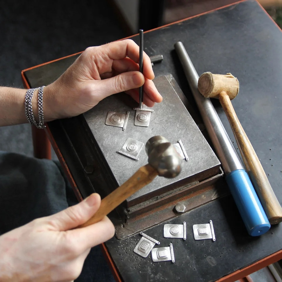 I began with clay. I built large, hollow, coil-formed sculptures—intuitive abstractions of everyday objects: vessels, buildings, trees, and tools. As a silversmith now, I continue to explore the visual language I first developed in ceramics, with the added challenge of creating wearable pieces. When I draw or paint, the exploration becomes more graphic, but the core impulse remains the same.